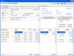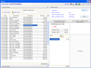 Prepaid Amount As you book a lesson, the software looks for any invoices for the given pupil and if found, debits the charge for the lesson, deducting it from the prepaid amount. It also notifies you of the amount left in credit. When the prepaid amount is exhausted, the software still books the lesson but this time no notification will be displayed. If a lesson is deleted, the prepaid amount will have an opening to book another lesson. ADI-diary.NET keeps track of such situations and the next time you book a lesson for this pupil the software will deduct the correct amount. If for any reason you gave more hours than prepaid for, you will be prompted to create a Top-up invoice or give complementary time. Now, suppose you did not create an invoice beforehand; never mind, the software will search for all unpaid lessons and create a cash invoice for them.